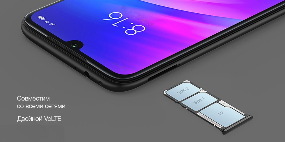 В максимальной комплектации Redmi 7 оснащен 64 Гб постоянной памяти, чего уже хватает для множества фотографий и видео, но специально для тех, кому нужно еще больше места, предусмотрен слот 2+1, куда можно установить две SIM-карты и одну карту памяти MicroSD объемом до 512 Гб, чтобы поднять объем хранилища до уровня ноутбуков.